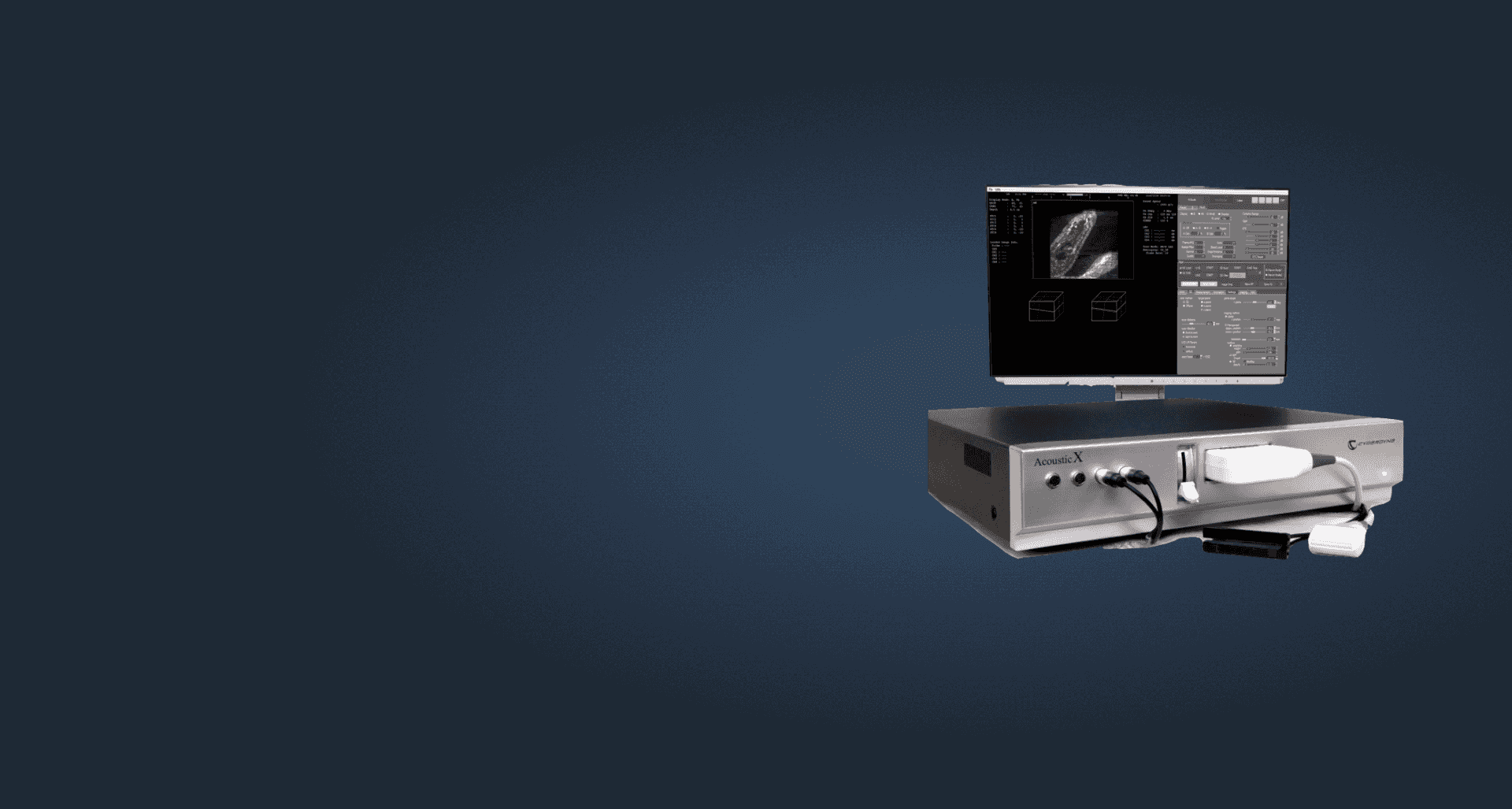 Acoustic X ist ein photoakustisches Bildgebungsgerät. In Echtzeit werden Bilder des in vivo Absorber durch Senden von LED Impulsen und erkennen der Ultraschallabgabe, dem sogenannten photoakustischen Effekt, konstruiert. Durch die Auswahl verschiedener LED Wellenlänge und die Einbindung der Ultraschallaufnahme wird der Ort der Zielsubstanz visualisiert.