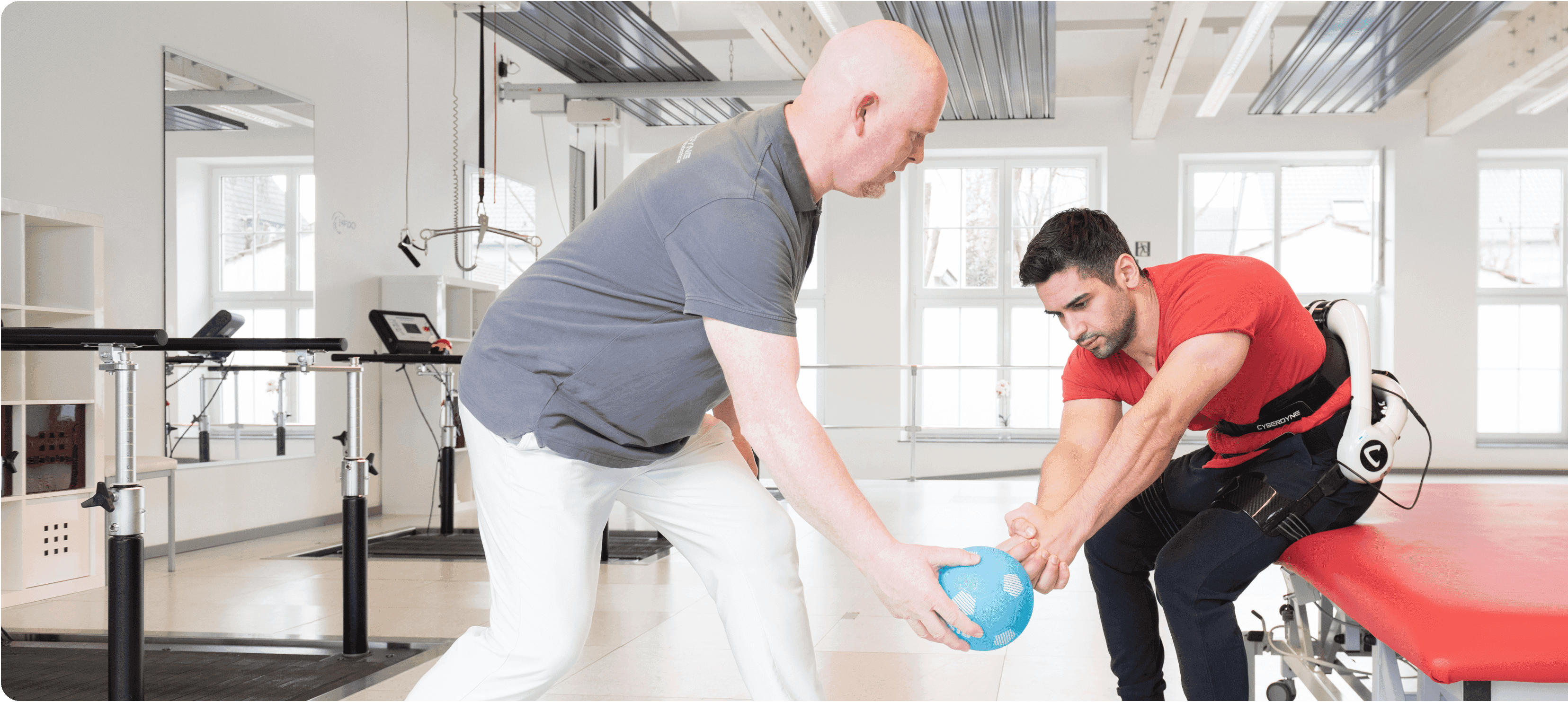 Individuen im Prozess des Wiedererlernens der richtigen Bewegungsausführung unterstützen. Unsere Technologie ermutigt Menschen eigenständig zu Gehen.